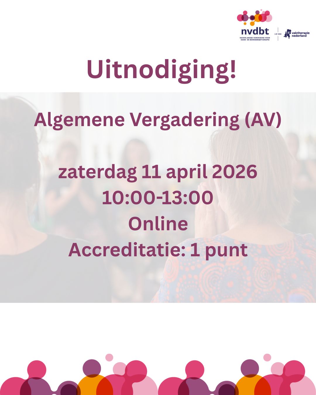 NVDBT staat voor Nederlandse Vereniging voor Dans- en Bewegingstherapie. De NVDBT is als zelfstandige beroepsvereniging lid van Vaktherapie Nederland.